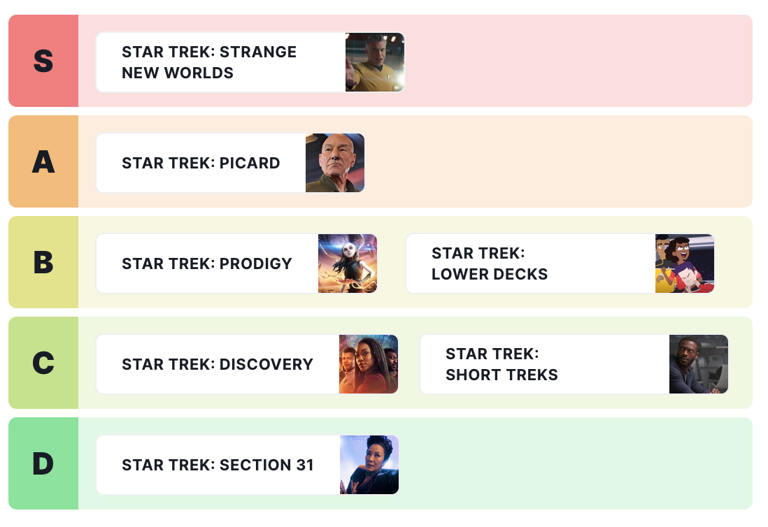 Explore my tier list below, then discover optimal Star Trek viewing order, updates on the live-action comedy and Starfleet Academy series, and the latest on Star Trek 4.